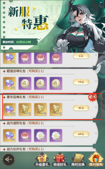 决战新服活动还有一个必买的礼包就是豪华召唤礼包了,120抽相当的实惠,必须要拿下。