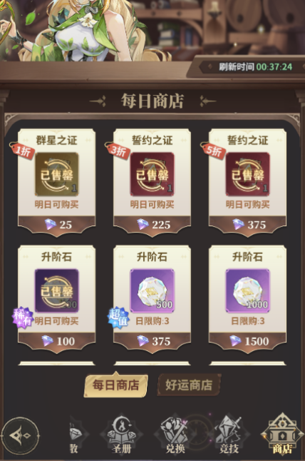 每日商店的内容基本是必买,前期升阶石根据自己钻石数量来决定是否买完,抽卡券是必买的。好运商店每天有5次免费刷新,可以刷新看看是否有自己需要的商品。钻石充足的情况下可以考虑开自动购买,全部扫完。