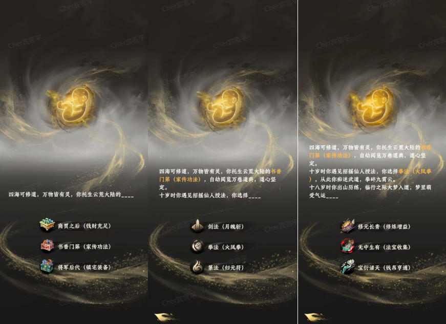 【出身】:影响新手礼包,商贾之后(灵石、材料)、书香门第(神通/功法)、将军后代(装备);推荐书香门第+剑+修元长青开局,输出高修炼快,更快节奏推图发育,容错率也更高