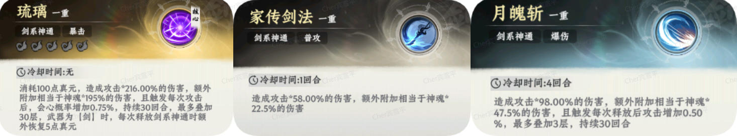 剑(暴击叠加):偏向属性神魄,技能多为神魄系数伤害和会心暴击的特性,注重神魄、身法属性