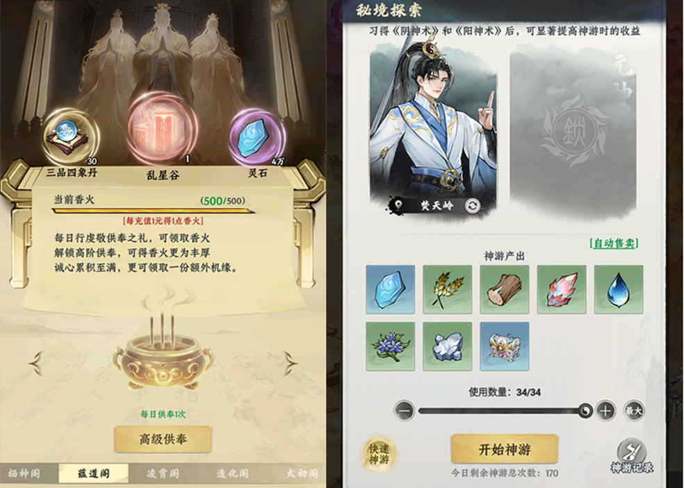 打完历练关卡记得去神游,神游就是扫荡关卡,可以获得很多的材料,包括炼丹炼器材料和升级洞府灵田的(每天的神游次数都是有上限的,正常上限200次,开永久特权卡250次,后续学习奇术也可提升上限;低阶关卡不要浪费太多次数;快速神游留到最后推不动关卡的时候再用,争取收益最大化)