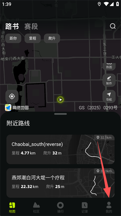 1、打开际刻骑行 APP,在底部导航栏点击 "我的",然后选择页面中的"我的路书"选项;