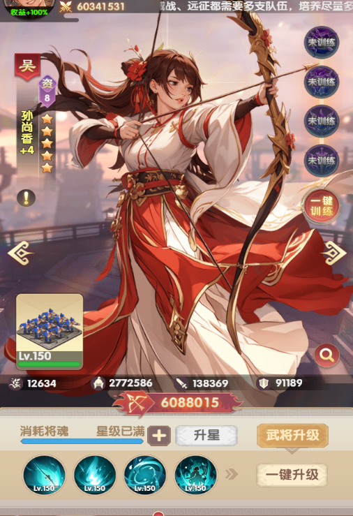 人物评价:8资质弓兵,堪比同等级10资质武将。8资质中效果最好用的武将,独特的主动回血技能使得她值得玩家培养,尤其在刷副本上面,效果格外显著。