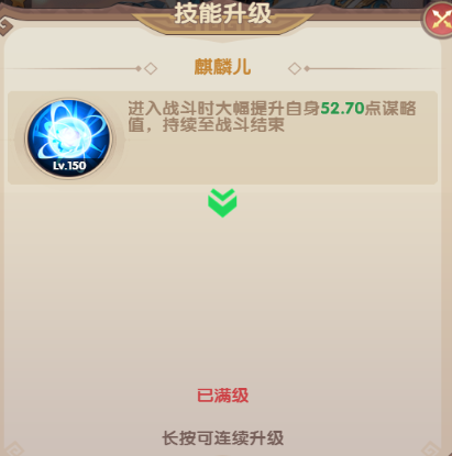 被动:每隔15秒回复自身周围2格内的所有友军兵力,回复效果受攻击影响。当自身兵力少于20%时释放,对自身周围3格子内的所有敌人造成一定额的伤害并使其晕眩6秒。战斗时大幅度提高自身谋略,持续到战斗结束。