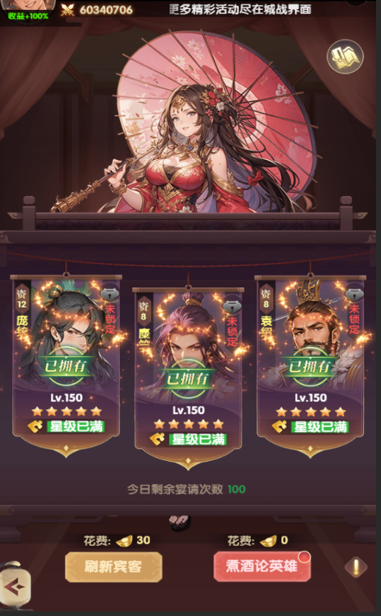 通过城池中的客栈按钮,可进入客栈。在客栈中可宴请指定3名武将,宴请武将后有一定几率获得大量将魂。