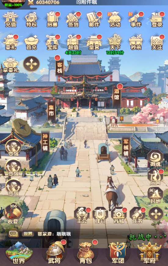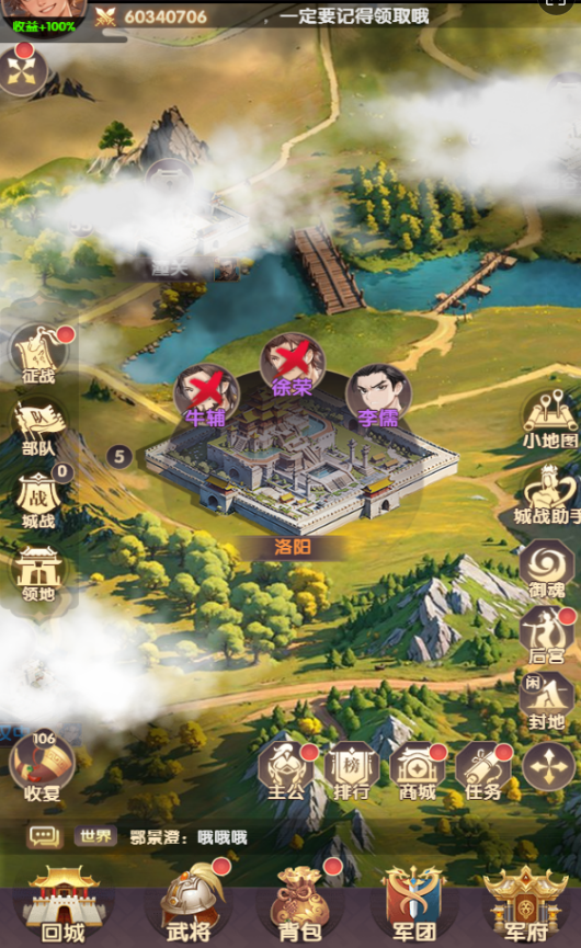 在城池中可进行酒馆招募、客栈宴请、集市购买道具、购买资源及参与战役活动。在世界地图中可进行关卡挑战,参与城战,拜访武将。