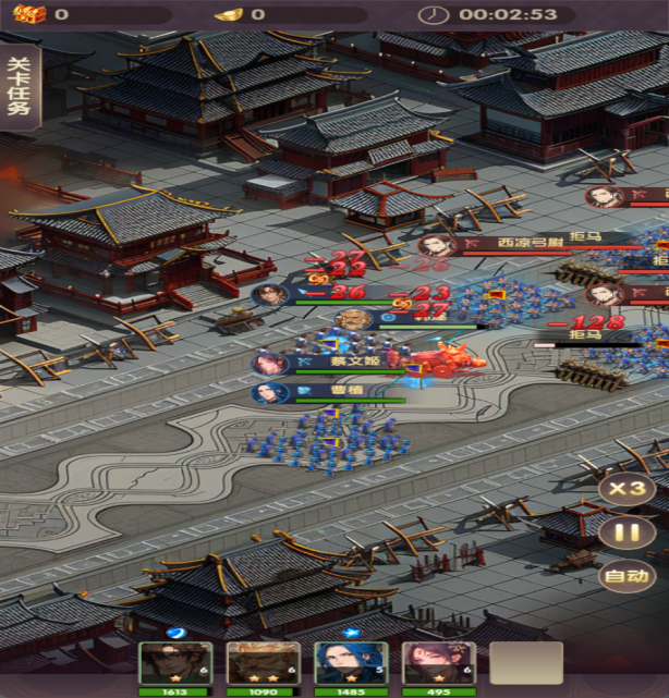 自动战斗:点击“自动”按钮后,所有武将自动索敌战斗,战意值满后自动释放技能