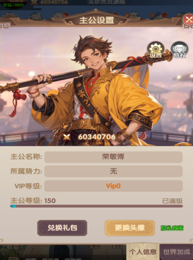 主界面左上角展示玩家名称、等级、经验条及VIP等级,点击头像会弹出系统设置界面,可在此处修改头像,兑换礼包,点击界面右下方的世界加成,点击设置关闭音乐音效。