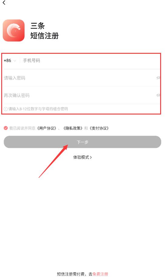 输入手机号和密码,点击下一步,按提示完成操作即可注册成功,提示:短信注册是需要付费的,如果要免费注册,可点击右下角免费注册,按提示完成信息填写,即可完成注册