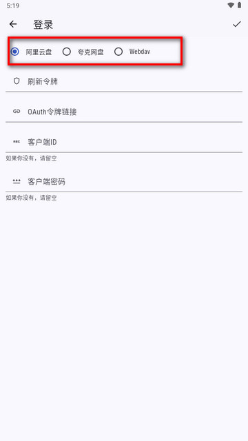 3、选择要使用的云盘,按照提示输入账号信息完成登录(具体的信息看下文说明)
