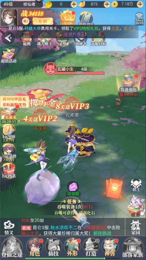 境界突破:修仙核心养成线,从筑基、金丹到元婴、仙尊,每阶突破带来巨额属性提升,高境界可压制低境界敌人伤害。