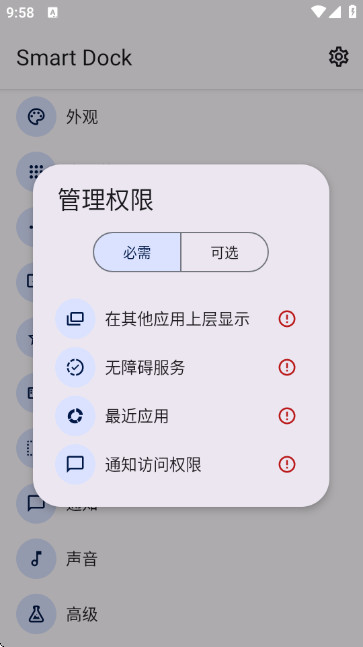 在其他应用上层显示(悬浮窗权限)、无障碍服务、最近应用、通知访问权限,这些权限不开启,可能会导致软件无法正常使用