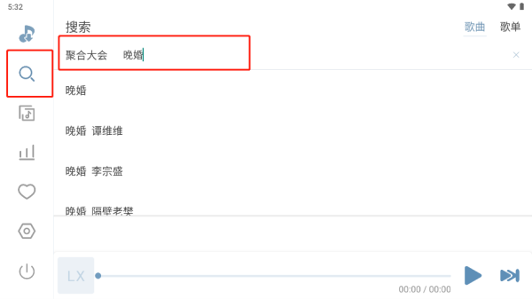 1、如图,先点击左侧放大镜,在搜索栏输入歌名