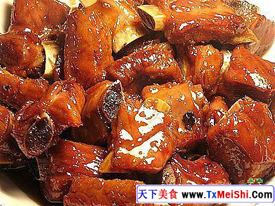 ③烧热锅,下油,至六成熟时,把猪排逐块放入油锅炸至结壳捞出,拨开粘连,捡去碎末,油温升至七成时,再将排骨下锅复炸至外壳松脆捞出。