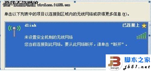 从此图中,我们可以看到我们的无线路由器也在其中,第一个dlink就是,但大家发现了,此无线网络没有任何安全性可言,显示为“未设置安全的无线网络”,也就是说,任何人只要能搜索到此无线网络,不需要密码都可以利用它上网,这就是所谓的“蹭网”。我们试一下,点击“dlink”之后,再点击下面的“连接”。