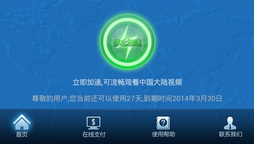 遥控器选中网趣云加速,首次进入会出现logo页面及使用帮助页面。试用期限是15天。然后进入首页。