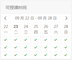 我们平台为你提供了设置可授课时间的功能。学生在老师个人信息页,可以看到你的可授课时间以及约课情况,这是学生选择老师的一个重要参考信息。除此之外,学生在你的非可授课时间将无法向你约课,因此建议你做好时间管理。