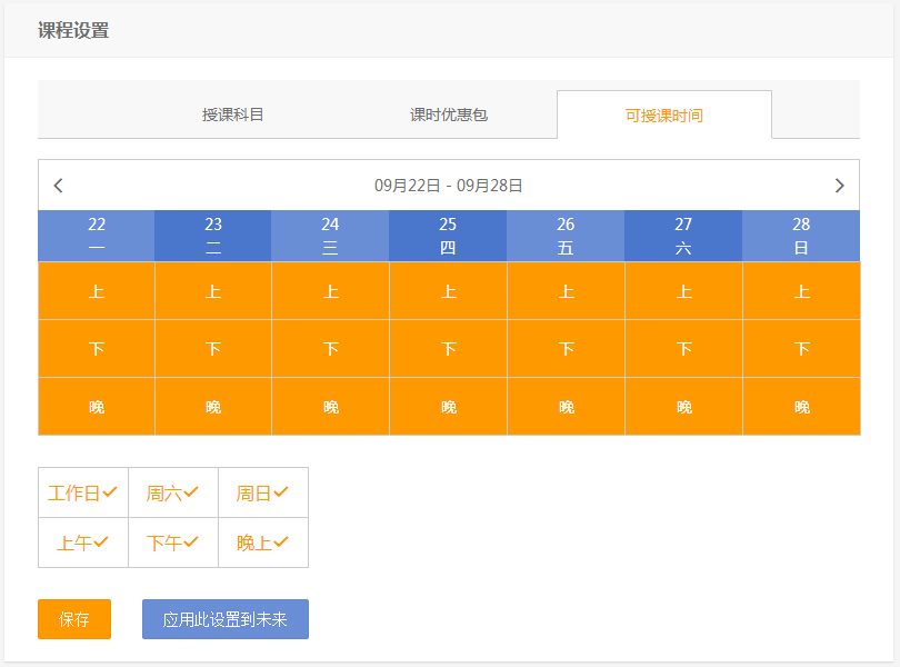 你可以在老师个人中心的课程设置页面点击“可授课时间”进行设置,保存后可以应用此设置到未来。