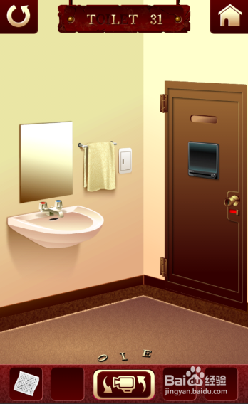 这关看到镜子上的字母把,切换到马桶看到墙上的字母=多少吧,意思就1-26个个字母对应的就是1-26.回到大门把字母对应的数字对上就好了!!