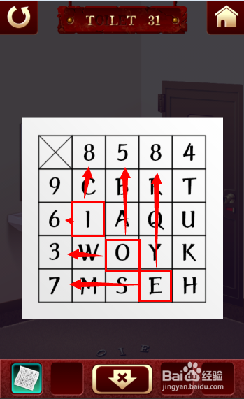 开始有个数字表,摇动手机掉下上方31关的字母,得到 OIE