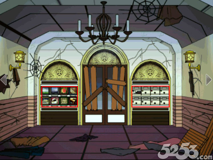 主角醒来后,发现自己来到了10年前住的公寓了。我们先观察门的两侧,左侧是八个风景图画,右侧有一排柜子。