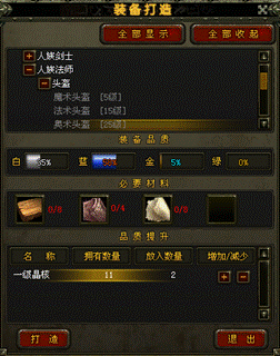 不同类型,不同级别的武器装备都各自的打造需求,每件装备需求2-4个材料。打造需求都在界面上方列表里,只要点击所需装备,界面中央的四个空格里便会读取所需材料和数量,同时读取背包里已有材料的数量和晶核数量,并进行对比显示。