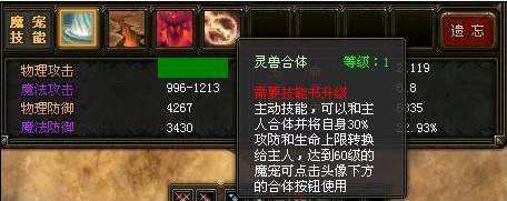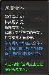 在游戏中,保证宠物拥有一个未使用的技能栏,右键点击【灵兽合体】技能书,开启后点击出征魔宠头像学习。