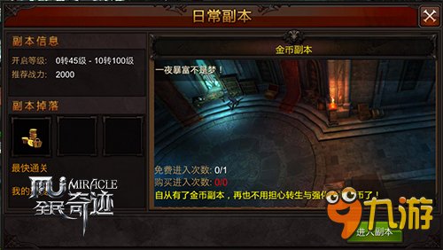 想进入《全民奇迹》的金币副本,玩家必须根据主线任务,将角色升到1转29级后,才能开启此副本。
