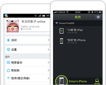 超大视频、大量照片通过点对点极速传送给iPad、电脑或其他手机设备,100M的视频不用1分钟搞定,不耗流量。